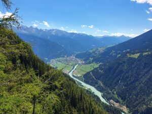 Von Nauders geht es bergab nach Laas. Die Etappe ist etwa 50 Kilometer lang und bietet eine atemberaubende Landschaft mit beeindruckenden Berggipfeln.